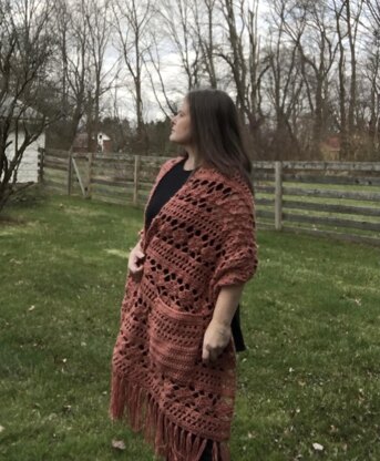 There are a number of ways to customize this pocket shawl. No pockets, no fringe, and variable sizes.