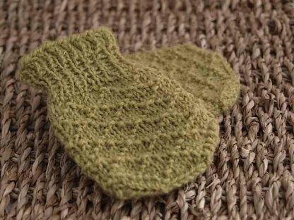 Simple thumbless baby mittens, knitted in round. Fits about 0-6 months old baby.