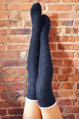 Treat your legs to luxury with these fabulous cable knit socks! This sock pattern will not only make your legs irresistible, it is an irresistible knit too! With an exquisite diamond cable and seed stitch pattern, and a fashionable knitted ruffle lace trim, these socks are so fun to knit that you won’t be able to put them down! This pattern includes options to knit these socks in ankle, knee high, or over the knee length to suit your sock wearing preferences. This design also gives you multiple yarn choices to choose from, from the super warm Patons Kroy Socks, to the light and breezy Knit Picks Stroll, to the gorgeous and breathable Knit Picks Hawthorne Kettle Dyed.