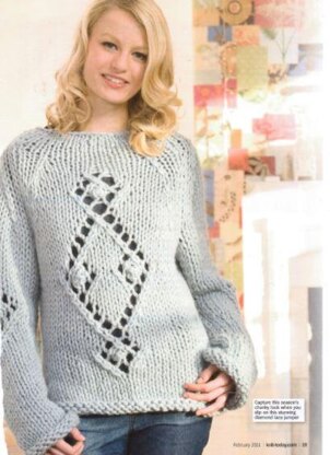 This is a pattern for Diamond Lace Jumper, originally designed for Knit Today. It is in Rowan Big Wool a really chunky yarn, which makes the diamond motif really big in scale, and quick to knit. Photo Knit Today.