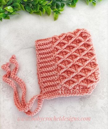 This pixie bonnet is crochet in a rectangle starting with a rib edging, then using a diamond stitch. It is then folded in half and sewn from the inside and crochet around the bottom to make the ties.