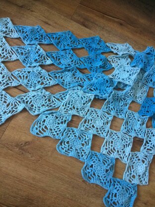 Finished wrap measures 151x44cm/59.5x17.5inches after blocking. Size is easily adjusted by working more or less motifs.