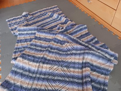 The “Diamonds and Crystals Wrap” is a rectangular wrap with I-cord edgings on both ends. It is worked back and forth in one piece. It’s a perfectly symmetrical wrap, so the length can be adjusted very easily.