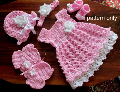 You can download one PDF file- including both the pattern for the dress , hat and Mary Jane shoes, headband and shrug in 4 sizes -newborn, 0-3 months, 3-6,6-9,-9-12 months Written in U.S. Terms