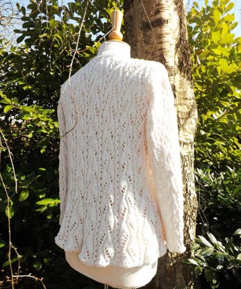 The pattern is written for a knitter who is able to work in the round as well as back and forth, follow lace charts as well as written instructions; and knows how to pick up stitches and make increases, decreases and button holes. (Directions is a combination of chart and text).
