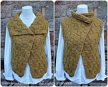 Textured basket weave pattern. Open front allowing versatile closure. Worked flat. Seamed.