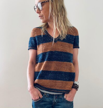 Inspired by cricket sweaters of the 90s, Dingley Dell is worked seamlessly from the top down using the contiguous set-in sleeve method (developed by Susie Myers) to shape the shoulders and sleeve caps. Firstly increases are worked on both RS and WS rows to the final shoulder width, then the sleeve caps are worked simultaneously with the V-neck shaping to sleeve separation. The body is then worked top down, in rounds to the bottom ribbing. Short sleeves are also worked top down, in rounds. Neck finishing is worked last.