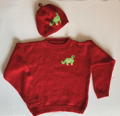 Easy knit pullover pattern with “super easy” graphs to knit into front of sweater and on hats. Kids love the dinosaur and spaceman craze now so you will be a big hit for making them a cute sweater and hat set like these!