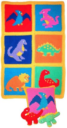 This bright and colorful dinosaurs afghan and pillow is made as individual, single crochet squares following full-color graphs. Pattern also includes 2 fun dino toys -- a Red Apatosaurus and Green Stegosaurus.Sizes: Afghan is 27.5" (70 cm) x 42" (107 cm); Pillow fits standard 14" pillow form; Red Dino is 7" x 9"; Green Dino is 5" x 10". All are made with #4 medium worsted weight yarn and size H/5 mm and G/4 mm hooks.