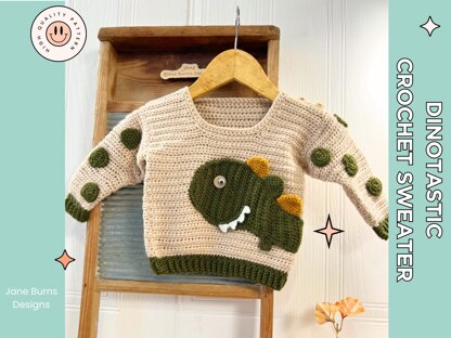 Create the most adorable crochet dinosaur jumper with this easy-to-follow crochet pattern! This playful baby sweater features a friendly dino appliqué complete with colourful spikes, spots, teeth, and a cheeky googly eye.