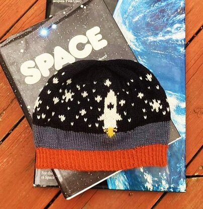 This hat celebrates that part of you that never stopped dreaming of a trip to the moon! The pattern uses stranded colorwork and duplicate stitch to make your very own rocket ship in a starry sky, while the Ladderback Jaquard method helps keeps tension in the floats at the back of the work consistent.