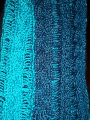 This scarf is double knit so it is completely reversible. Each side has its own cable braid pattern. The dropped stitches allow for an interesting effect, and also allow a bit of the color on the opposite side to show through. You can choose any complementary or contrasting colors you desire. Warning: It can become a bit tedious to create the cables, but I think it is well worth the end result. Happy knitting!