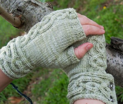 In these fingerless mitts, the central cable dances around each of the two side cables in turn. The name is also a play on words referring to Malabrigo Dos, one of my favorite yarns.