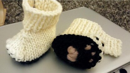 Yarn: 30 [35] metres / 33 [38] yards of (100% Wool Super Bulky, 54 yards / 50 grams) in off white. 20 [25] metres / 22 [27] yards of (100% Wool Super Bulky, 54 yards / 50 grams) in colour for the sole. A couple of metres / yards in super bulky yarn to make the paws (pink or brown shade). A few cm / yards to sew the claws (black.