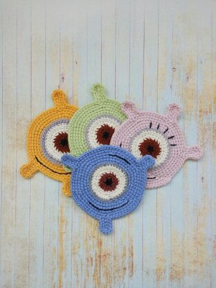 Crocheted doilies «Merry aliens» Using this pattern you can crochet funny coasters for children. Skill level – easy. The pattern does not contain lessons on crocheting and assumes the basic skills, such as a single crochet and double crochet; increases and decreases; rows and stitches; to start a crochet with a magic ring; to pull off the stitches and hide the tails; cross-stitching. Abbreviations: ch – chain sc – single crochet dc – double crochet sl st – slip stitch inc – increase dec – decrease rnd – round Materials and Instruments: