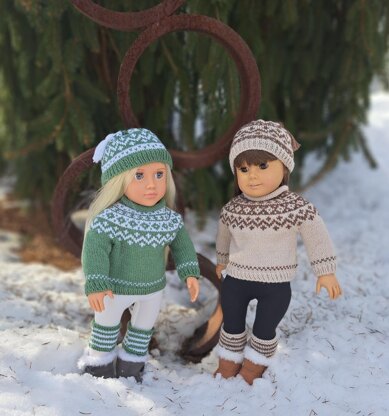 Round yoke style pullover style sweater pattern for most 18 inch dolls. Adorable matching beanie and boot cuffs. Stranded color work in simple fair isle patterns at yoke, hem and sleeve cuffs. Familiar stitches are used, and set can be completed in a few evenings for your favorite little girl to play with!