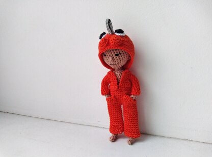 I'm glad to introduce this amigurumi doll, which comes with a removable all-in-one suit featuring a chainsaw devil hoody. The doll is completely soft and does not have a wire framework. Its body is seamless, as the legs, arms, body, and head are all crocheted together. Once the body is completed, the next steps are to crochet the ears and nose, embroider the doll's face, and then sew all the details together. Finally, the playsuit and dress can be crocheted for the doll.