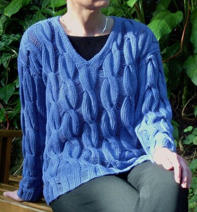 Make the most of cool summer breezes in this classic V-neck with airy dropped stitches between the cables - just like being in beautiful Door County, Wisconsin Sizes: 40" - 48" Gauge: 5 sts/inch on #5 needles