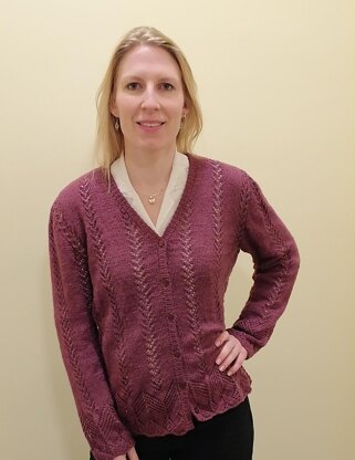 The Dorella Cardigan is worked flat. Due to the lace pattern the back part and the front parts are worked in one piece. You can work on single point or circular knitting needle. The sleeves are set in after having closed the shoulder seams. There is an extra chart for the sleeves. The front band is in rib 1/1 with buttonholes.