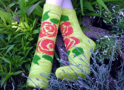 Die Dornröschensocken werden von oben nach unten offen gestrickt, dabei wird die Rückseite der Socke angestrickt und gleichzeitig eine Herzchenferse gearbeitet. Um die Socken stricken zu können, sollten Sie diese Techniken beherrschen: Intarsien, Norwegertechnik, verkürzte Reihen (Ferse), Zu- und Abnahmen