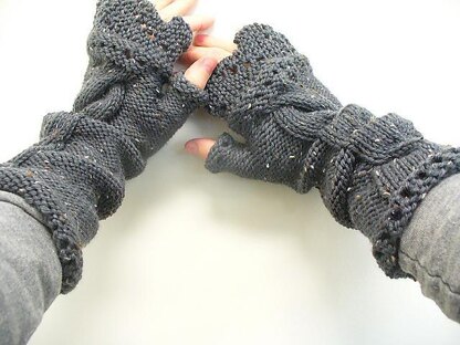 the mitts are working inside out (to get the reverse stockinette without all the fussy purling) with a 12 stitch cable. the body of the mitt starts out a bit loose and then tightens up around the finger area. the mitts are finished off with a knit on lace edging in garter stitch.