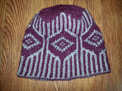 This hat is knit in a round using a size 12" circular needle. An understanding on Double Knitting is helpful in knitting this pattern. Double Knitting is cast on in 2 colors and is knit in pairs with a knit stitch and a purl stitch in each pair. You will need two colors of yarn, preferably ones with a contrasting color, one light and one dark. The hat is totally reversible! You can wear it either way. The pattern knit on the front side is duplicated on the back side in the opposite color! Very fun!!