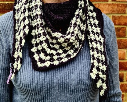 This is a top-down triangular shawl using fingering or lace weight yarn. It is a squishy warm design that knits up quickly. Great for a beginner or intermediate using double lattice pattern with a sequin eyelet edging.