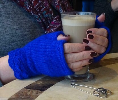 There are 2 patterns included. The first is for 'simple' mitts which are knitted straight and seamed leaving a gap for the thumb. The finger end has a crochet cast off and the wrist end has a crochet cuff added in the round. The second pattern is for mitts knitted in the round with a thumb also knitted in the round. Again there is a crochet cast off and a crochet cuff.