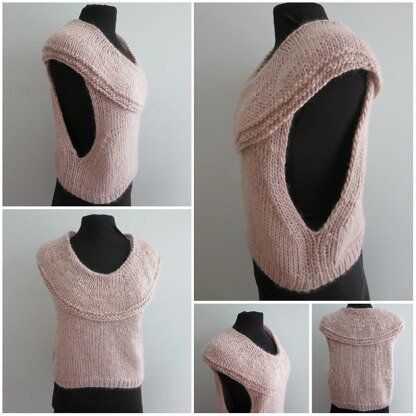 The Downton Victorian Collar Vest is fashioned after the Bertha Collars that were popular during Victorian fashion. Designed to accent a woman's shoulders, the Bertha Collar was wide, round, and flat. Other feminine features of the Downton Vest are a shapely waist to hip tapering, elongated open sides, and a graceful neckline. The vest is knit in one piece with Kitchener seams at the shoulders. Stitches are picked up along the neckline to create the Bertha Collar. The collar adds extra warmth because it creates a double layer of fabric just where you need it most.