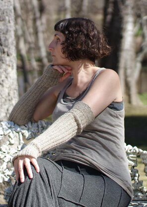 These opera-length fingerless gloves feature a simple slit opening for the thumb, and a split, garter stitch cuff above the elbow. The extra long ribbing at the hand can be worn down over the fingers for warmth, or folded back for mobility. Fold the cuffs over the thumb opening and they become arm warmers. A cable detail neatens the thumb opening, and an i-cord bind-off finishes the cuff.