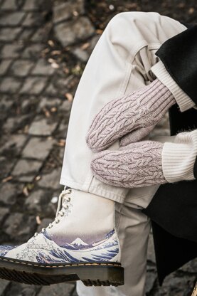 Needles and Materials:– Primo Fingering by The Plucky Knitter (75% merino wool, 20% cashmere, 5% polyamide/Nylon; 115 g – 402 m 4 oz – 440 yds) – 30; 40; 50 g 1; 1.4; 1.75 oz total – double-pointed needle set 2.0 mm US0 and 3.00 mm US2.5 or other appropriate size to obtain gauge (double-pointed needles may be replaced with circular needles if working using the Magic Loop method). – 4 stitch markers, tapestry needle, cable needle, stitch holder or waste yarn for holding thumb stitches.