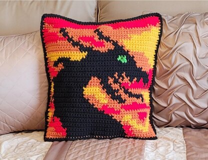 Have you ever seen a dragon at sunset? Combining red, burnt orange, and gold for a sunset background with a menacing black dragon creates this gorgeous throw pillow for your living room or bedroom. The pattern includes color-coded chart and also line-by-line directions to crochet this dragon with a double strand of worsted yarn.