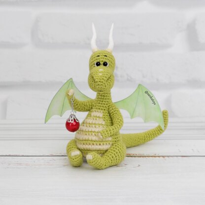 I used: «Slonim» bobbin yarn in 2 threads (cotton+acrylic, 100g ~ 808m, near 42-45sc in 4 inches). Also suitable yarns Gamma «Iris» (cotton, 10g ~ 82m) or YarnArt Iris (cotton, 20g ~ 138m) or floss in 3-4 threads. Colors: green, light yellow. Also you need white floss to make horns, and black to embroider eyebrows.