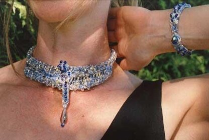 A dazzling and unique neckpiece created in two pieces for a sculptural effect. Two different methods of using beads are used, one for the body, one for the wings and neck cord. The matching bracelet echoes the beading pattern found on the wings of the dragonfly.