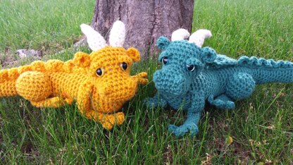 Finished dragon stands about 6inches tall and 12-13 inches long, when using Red Heart Super Saver Yarn.  Gauge is not important.