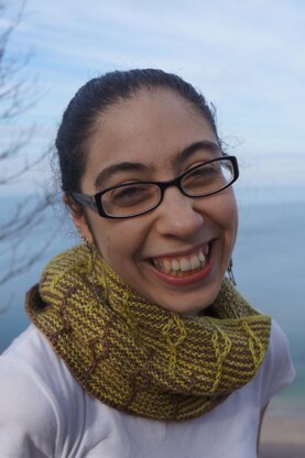The Dream Track infinity scarf is knit in garter stitch in the round (knit 1 rnd, purl one rnd). A series of slipped and twisted stitches creates a reapeating pattern across the surface. Each rnd uses only one color at a time.