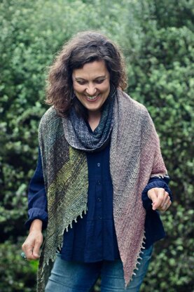 Dreamweaver is an exquisite shawl, combining a medley of colours and textures – echoing the beauty of fabric created with a loom but using knitting needles instead!