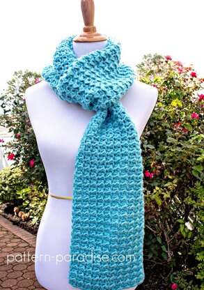 Approximately 8” x 66” (Sizing easily adjusted) Designed in worsted weight yarn