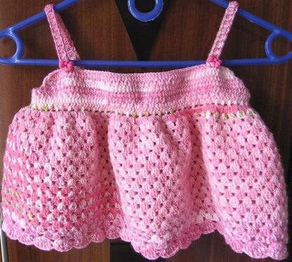 Dress for your baby in summer. Continuous crochet without sewing. This dress is for baby from 3 months above. You can easily make it smaller, bigger, longer or shorter (wrote in the pattern). You can make it longer by repeating row. You can make it bigger to fit with your child or even mature. This dress is making from top down. Hope you enjoy it :)