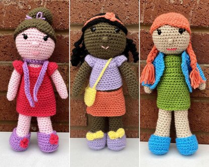 In this pattern you will be able to make your own customizable doll. This doll can be made in any skin tone and your choice of 3 different hair styles. The dolls can be changes into three different outfits that can be made in any colours you like.