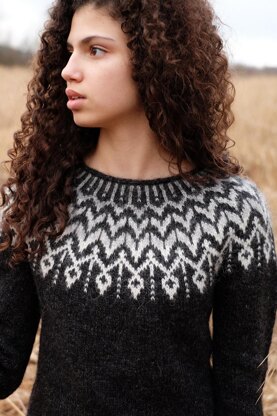 Dreyma means dream in Icelandic. This sweater is worked seamlessly from the top down, starting with the option of either a ribbed or rolled neckline. The stranded yoke is worked, short row shaping is added on the back of the sweater to shape the shoulders and neckline. The sleeves and body are separated and worked top down. There is an option for gentle waist shaping. Aran or worsted weight yarn. Designed to be worn with 2-4 in / 5-10 cm positive ease. Shown in Size A with 3.75“ / 9.5 cm positive ease.