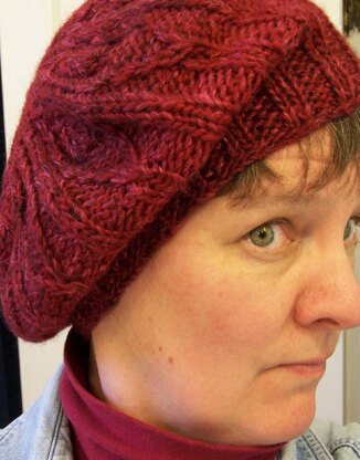A tam or a slouchy hat – your choice. Starting at the 2x2 ribbing in the round, the leaves bloom and, thru strategically placed decreases, all leaves meet at the center top.