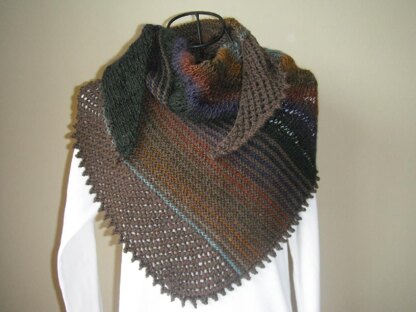 The first section is stocking stitch with interspersed dropped stitches knitted in a long repeat variegated yarn; next is a 2 colour garter stitch section using the variegated yarn and a contracting single colour yarn; finally a simple lace section with a picot bind off in the single colour yarn which continues around the second edge of the shawl.