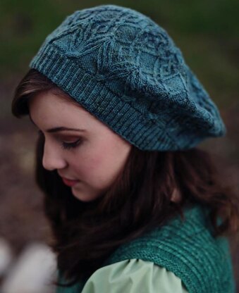 This slouch-style hat begins at the band with a twisted stitch ribbing and is knit in the round. The body of the hat is worked in intertwined “tree bark” twisted stitch patterns, and the crown is shaped with decreases interspersed with small lace leaf motifs.
