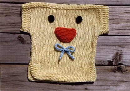 Easiest ever basic top to knit! Then knit the features like duck bill, and eyes and bow, and you are almost done! Kids love this shirt! It is a good warmer weather wearable , or pair with a turtleneck shirt for winter wear! Make some in plain colors too, as this pattern is so easy to knit! We used worsted weight yarns, knitting needles, US # 10.5