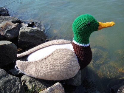 Knit in the round, and mostly in one piece so there is very little seaming. Short rows are used to shape the chest, head and wings. They are 12 inches long from tip of bill to tail, and 7 inches tall - just about the size of a real duck!