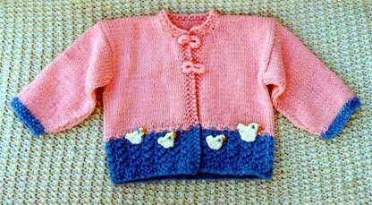 A very easy, almost oriental looking baby sweater! This really knits up so fast, you will not believe it. The pond at bottom of sweater uses a simple textured stitch. Then when sweater is done, you knit simple ducks and sew onto pond. It looks so cute on any baby! Uses worsted weight yarns, knitting needles, US # 5, and # 8. Finished chest sizes are 18, 21 and 23. This can be knit in any colors you wish.