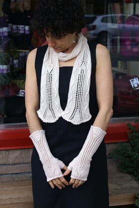 Two lovers... Lace and beads provide sinuous lines in this poetic glove and scarf duo. Fan and Leaf lace motifs are framed by twisted ribs in the gloves and mirrored beaded waving cables in the scarf. The gloves are sized for women’s small, medium and large, in two lengths .