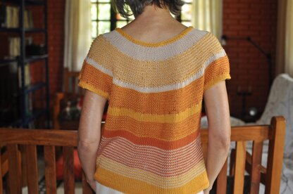 Dunas tee is knitted from the top to the bottom using the Top-Down method, completely seamless, structured with a round yoke and colored stripes.