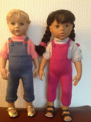 Knitted on straight needles,dungarees are very easy to knit. Jumper is knitted 'bottom up' with sleeves added, ( no front and side seams to stitch up, only sleeve seams need joining), and is also not complicated. I try to design my patterns to be quick and easy to knit; little ones don't want to wait for their dolls new outfits!